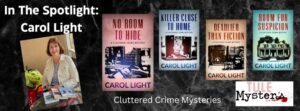 My pal and fellow Tule Publishing author Carol Light is in the spotlight today with her newest book in the Cluttered Crime mystery series, and I couldn’t be more pleased to welcome her back! No Room to Hide releases today and I gotta tell you, I got a sneak peek, and it’s another winner!