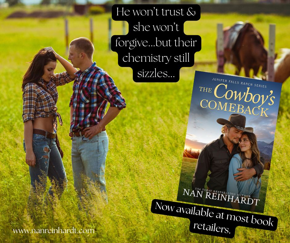 Bonjour, mes amis! Cue the confetti! Light the fireworks! The Cowboy’s Comeback, Book 2 in Juniper Falls Ranch, my very first cowboy contemporary romance series. I’m doing it–writing western romance–and I’m having the time of my life! As I work on finishing book 3 in this new series, I’m falling more in love with the little Montana town of Marietta with each book.