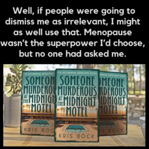 But when Kate’s hot flashes wake her in the middle of the night, she wanders outside to cool off and stumbles into a crime scene. Soon they’re caught up in their toughest—and most dangerous—case yet. Kate and Jen can’t trust anyone at the motel or the local police force they suspect of corruption. Good thing they have their eclectic senior sidekicks to share the undercover work.