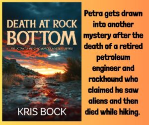 “This second Reluctantly Psychic Murder Mystery was another very entertaining read from Kris Bock. Death at Rock Bottom takes us to the New Mexico desert, with an interesting protagonist that I really like, and a very intriguing mystery. Kris Bock’s detailed descriptions pull readers right into the story. From the museum to the desert and every place in between, I felt like I was right there.” – Escape With Dollycas Into A Good Book