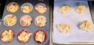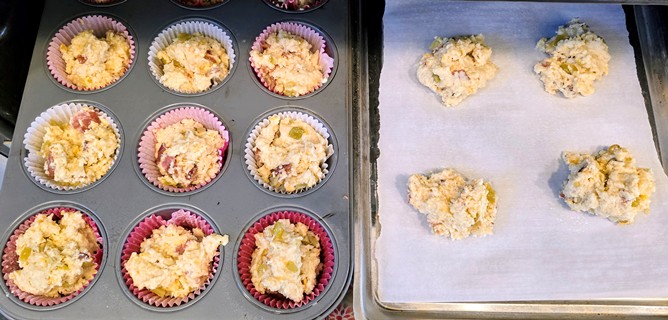 Fill each cup about 3/4 full or drop spoonfuls (about ¼ to ½ cup) of batter onto a baking sheet.- Bake for 15-20 minutes, or until golden brown.