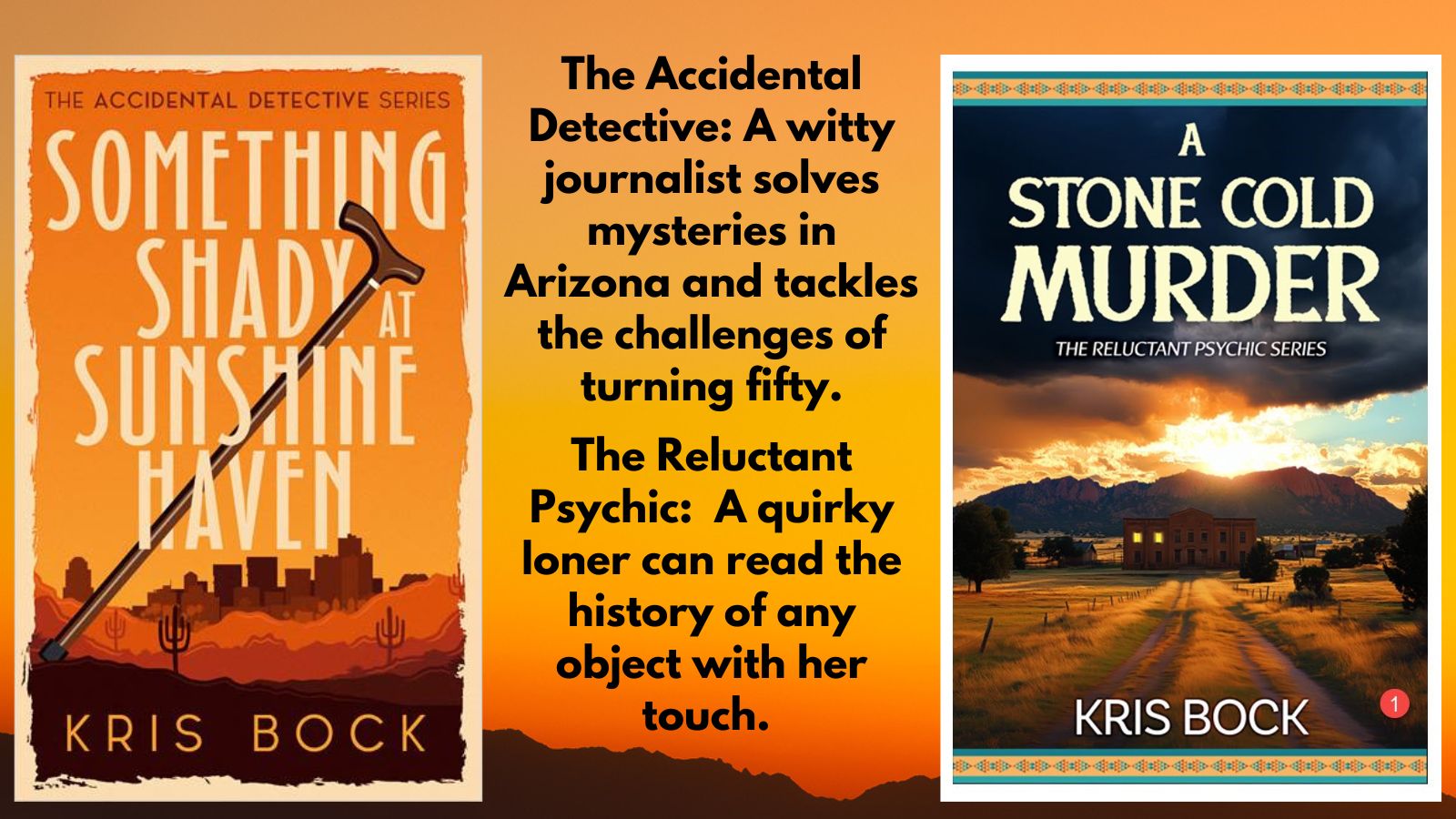 Kris Bock writes mystery, suspense, and romance, often with Southwestern landscapes. In the Accidental Detective humorous mystery series, a witty journalist solves mysteries in Arizona and tackles the challenges of turning fifty. The Furrever Friends Sweet Romance series features the employees and customers at a cat café. Watch as they fall in love with each other and shelter cats. In the Accidental Billionaire Cowboys series, a Texas ranching family wins a fortune in the lottery and find out winning the lottery causes as many problems as it solves. Kris’s romantic suspense novels include stories of treasure hunting, archaeology, and intrigue.