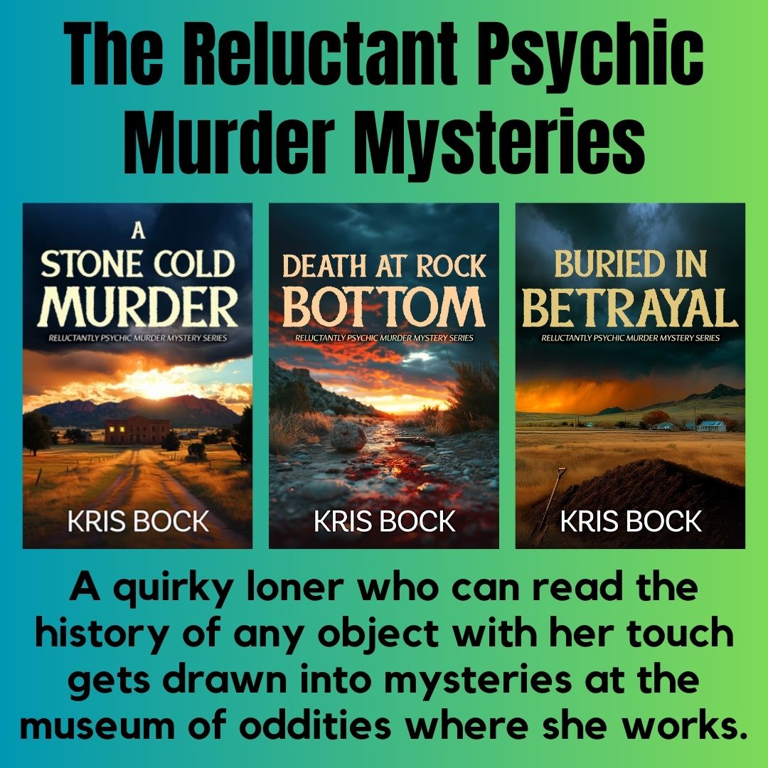 Sign up for the Kris Bock newsletter and get short stories from the Reluctantly Psychic and Accidental Detective series plus other freebies. Then every two weeks, you’ll get fun content about pets, announcements of new books, sales, and more.