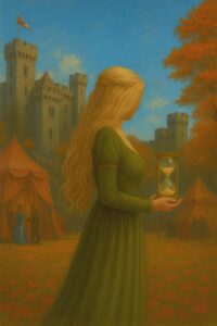 The first scene takes place at a village market. The castle in the background isn’t located as close as this looks, but I wanted to include the castle. The hourglass depicts the relevance of time to the series.