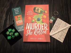 Giveaway: A signed, paperback copy of Murder, She Rolled, a bookmark, a keychain of a potted plant reading a book, a little notebook that looks like a library check-out card, a pen that reads There is no such thing as too many books, and a set of green/gold dice.