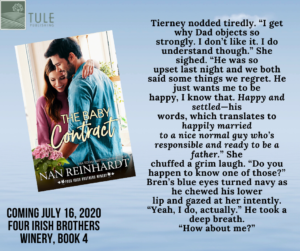 Here’s a little sneak peak at a scene from The Baby Contract, Book 4 in the Four Irish Brothers Winery series releasing July 16, 2020 from Tule Publishing. You can preorder now and it will be waiting for you on your e-reader July 16! How fun! So, a little setup for this scene: Brendan Flaherty has just offered to father his friend Tierney Ashton’s baby. However, her idea of how it will all work is completely different from his! Enjoy the excerpt!