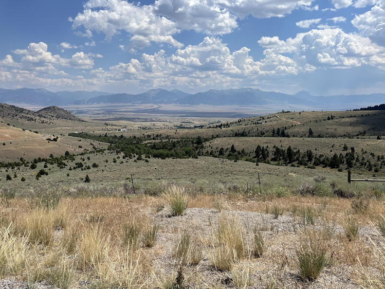 The drive there and back was equally fascinating because the landscapes were so very different from each other. Here in Big Sky, it’s all huge mountains and pines. As we headed west, the landscape changed to rolling hills and pastures and wheat and hayfields with junipers dotting here and there and ranches and fences and sagebrush. I absorbed it all–even-saw a ranch that reminded me of what I imagined Del Foster’s ranch to be–and oh, the cows and horses!