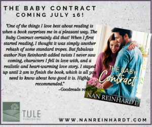 So very excited to let y’all know that ARC reader reviews are coming in and THE BABY CONTRACT, Book 4 in the Four Irish Brothers Winery series, is a hit! I’m so pleased readers are loving Brendan and Tierney’s story! I’ve enjoyed my River’s Edge stories so much, I’ve decided to set my next series in the same little river town. Watch for news about the Lange brothers–Ryker, Becker, and Max, coming soon! Meanwhile, you can preorder THE BABY CONTRACT today and it will magically appear on your e-reader on July 16!