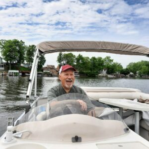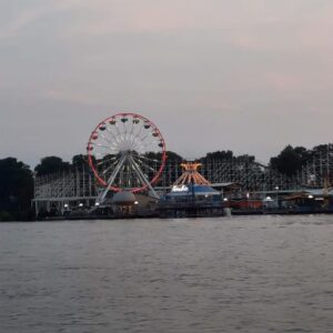 We had a great breakfast, and then went over to Son and DIL’s to visit over second cups of coffee. Son had yard work to do, so he and Grandboy took care of that, while I wrote some more and Husband chilled (he’s still healing), and DIL did her thing at their house. In the early afternoon, we loaded onto our boat with towels, coolers, sunscreen, and sundry, and headed out onto the lake, which wasn’t really all that busy considering it was a gorgeous July weekend…until we got down to the amusement park (known to locals as “the beach”).