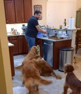 If you know me at all, you know I’m not particularly a dog person, in spite of having three–yes, three–granddogs. They are all sweeties, but I’m very glad they live at Son’s house and not mine. (I realize the photo below shows four dogs with Son–it was Thanksgiving and his parents-in-law had brought their two critters over for the holidays, so four in the picture, five altogether that day!)