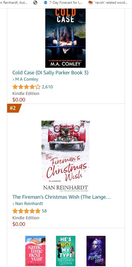 Gratitude for this week: Fun Christmas holiday with the kids and family; shared a fun morning with my friend Connie; been watching The West Wing again; enjoyed a fun evening of cards with old friends, Ray and Bessie and new friends, Dave and Nancy and Chuck and Genny; the BookBub for The Fireman’s Christmas Wish did pretty well–we made it to the #2 spot on the Amazon Top 100 Bestsellers list and saw some good read-through.