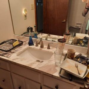 On a more practical note, our kitchen drain stopped draining, which is its only job and it feel very unfair that it has turned in its notice. Husband and Son worked on it on Friday to no avail. So we called a plumber and I found out, to my surprise, that calling a 24/7 emergency plumber doesn’t mean they’ll be right over. It means that apparently a clogged kitchen drain is low on their priority list. The plumber comes tomorrow–Monday–sometime between noon and 4 p.m. In the meantime, I’m washing dishes in the guest bathroom.