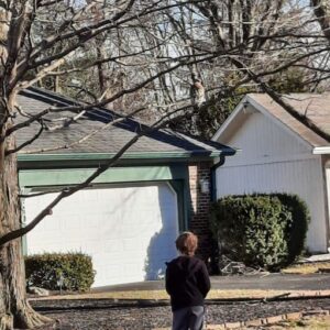 Yesterday Son and Grandboy came by to help us out with a couple of things and a pair of hawks landed in the yard, looking, we hope, for moles. We were all fascinated by how close they let us get to them. I think they were focused on food while we were focused on them. Son took a lot of photos, but I only got this one of Grandboy talking to Mr. Hawk after the bird had flown up to our neighbor’s maple tree.