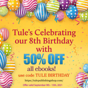 But first, a quick bit of Tule Publishing business–we’re celebrating our 8th birthday with a 50% off sale on all e-books (including mine!), so hop on over to the Tule Shop and get happy!