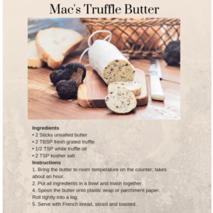 I hope when you read one of my novels, you google Four Irish Brothers Winery for a map to get to it (you can’t find one–it’s fiction), or at the very least, you google Indiana wineries and go out and find some great traminette or pinot noir. Or even google how to make truffle butter (okay, I gave you that one below), and enjoy a warm buttered baguette and glass of wine as you read.