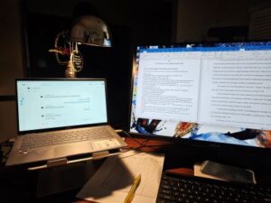 For this trip, I took along a couple of yellow legal pads, anticipating that I might be writing part of my story longhand (you know, cursive… a lost art, I’m told) because I’ve been having issues with my laptop overheating. Not only is it my travel computer, it’s now officially my office computer since I dumped my old PC and now use the laptop exclusively. Son and DIL set me with a large-screen monitor that I attach the laptop to when I’m working at home and I love, love having everything in one place. It’s great. However, the overheating thing. The silly thing started getting rocket hot on charging and then crashing now and again. Not good.