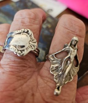 PJ also had a ton of jewelry that she put out on trays for people to peruse. When I got there yesterday she handed me a little silk bag that included some anklets she thought I might like to have (I do!) and two rings that our mom wore always. One made from her baby spoon that she wore on the middle finger of her left hand and Mom’s fairy ring that she always wore on her index finger. Mom had beautiful hands–long fingers and perfect nails–and my clearest memories even 36 years since she passed are those two rings on her hands. PJ’s had them with her all this time and now it’s my turn. My hands are freckled and old and my fingers aren’t long and elegant like Mom’s were, but I love having these little pieces of her. Thanks, sister!