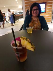 As I sipped, I debated whether I really wanted to swim, but when I checked my step count on my FitBit, I realized I hadn’t gotten enough steps in yet, so I got in the pool and swam some laps. It was nice until the rain started and they asked us to get out of the pool and stand back under the canopy. So we did. Then the sun came out and I went back out to my chaise, sipped my beverage and read for a little bit. Until… it started to rain again. The rain and the wind sent everyone inside at that point. This time I packed up my stuff and took shelter in the bar, where another gracious server asked me if I wanted lunch. It was 1 p.m… I did want lunch, so I ordered the fish tacos and man, were they delish!